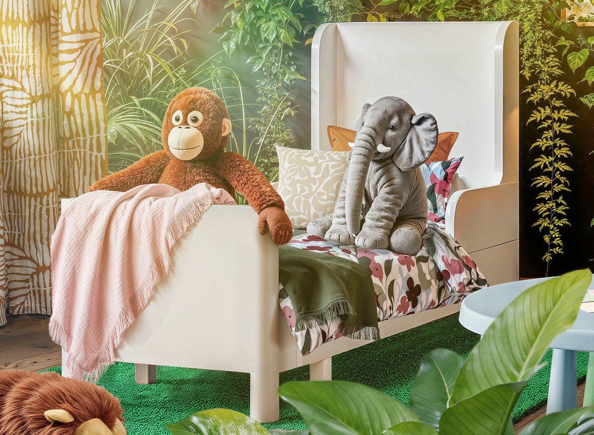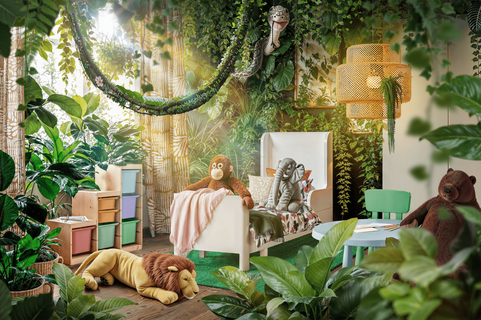 Ruhig schlummern und lustig herumtollen – als ob man sich im Dschungel befindet? Mit IKEA ist das möglich. Durch die Verwendung künstlicher Intelligenz haben schwedische Experten jetzt Wünsche der Kinder erfüllt und ein ideales Dschungelmotiv-Kinderspielzimmer mithilfe von IKEA-Produkte gestaltet.